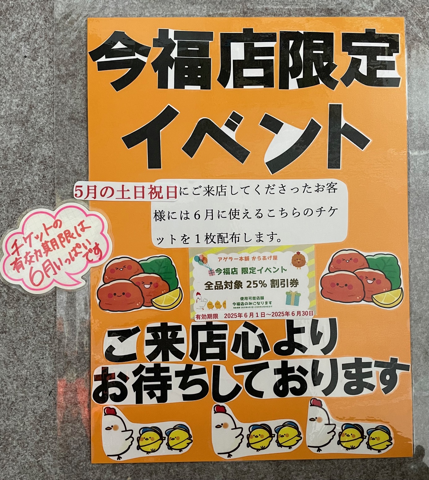 5月の土日祝日にご来店されたお客様に、6月から使える25%オフチケットを1枚プレゼントします!